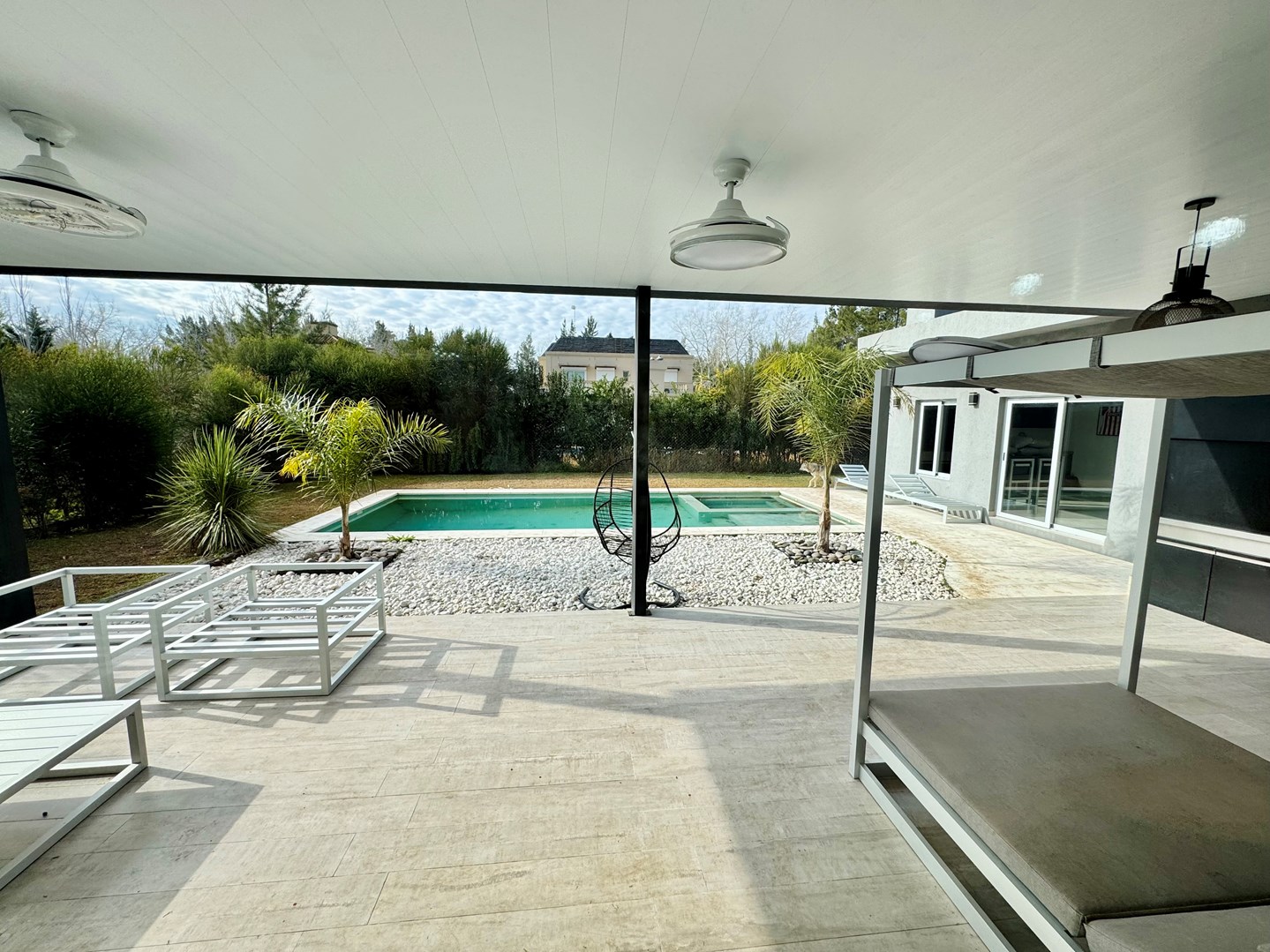 En el contrafrente de la casa se destaca su diseño junto con la hermosa vista al parque y piscina desde la galería.