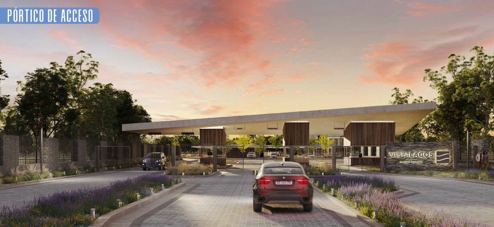 El acceso al barrio se dará mediante un boulevard de 3 carriles de entrada y 2 carriles de salida, enmarcando el acceso con un Portal de entrada acorde al lenguaje arquitectónico del emprendimiento.